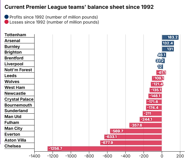 自1992年以来,英超俱乐部总共亏损达到了49.9亿英镑,其中90%由10家俱乐部贡献。切尔西是亏损最多的,他们英超时代的亏损超12亿英镑,主要在阿布时代。
